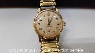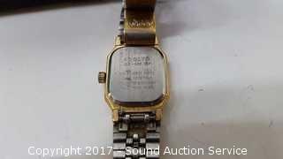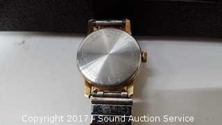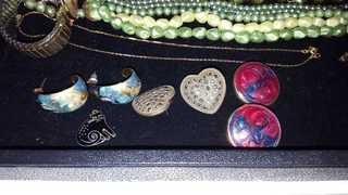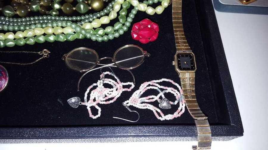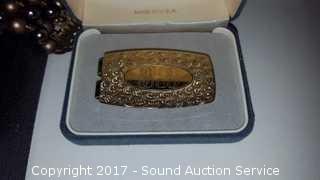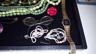 Comes with nice vtg. Caravelle wind up gold tone waterproof 7 jewel wristwatch, in good working condition, monogrammed money clip, necklaces, eye glasses and more.
