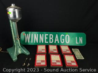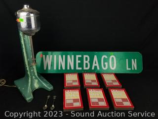 6 Vintage punch cards, teaspoons, Winnebago street sign, olde milkshake mixer (no power).