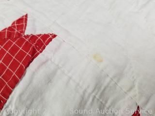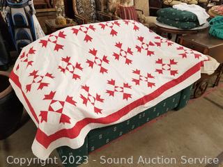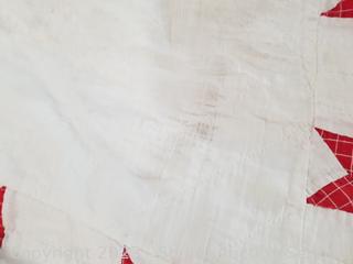 Comes with a Note from consignor says " The Quilt was made by my aunt and her sister, made from worn out work sheets and Muslim and feed sacks. Almost all hand stitched with finish treadle machine" 93-1/2" x 81-1/2". "I am the last girl in the family and would like to share with others a piece of Americana". In great condition given it's age.