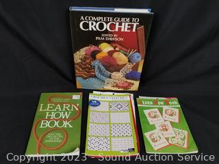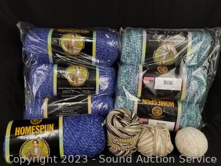 Yarn, knitting needles, crochet book, etc. Refer to photos for lot contents.