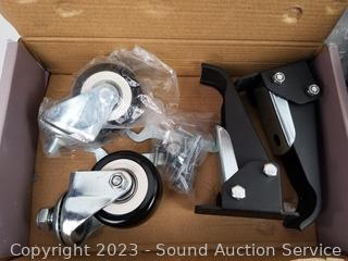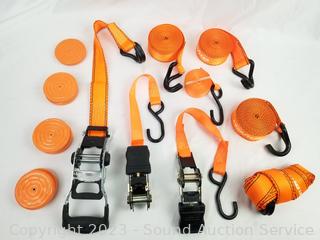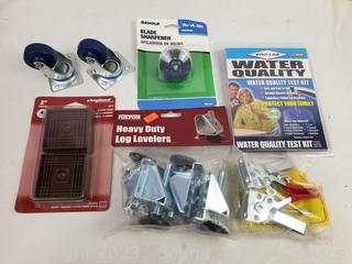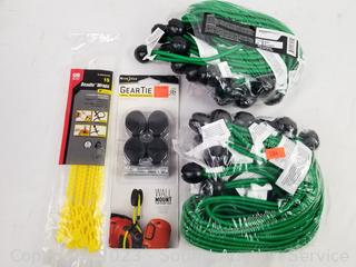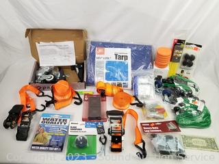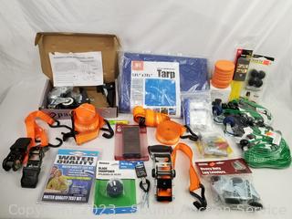 Tarp, ball bungees, ratchet straps, shop bench casters & feet, other shop item. Refer to photos for lot contents.