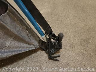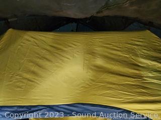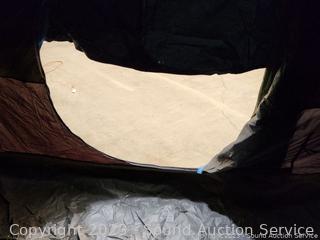Only information I have was on a note "Ties at peak of tent missing 1 half, stiff works though, used, good condition", refer to photos for more info.