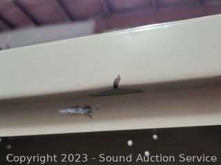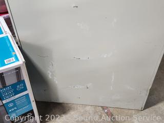 72" H x 36" W x 18" D. Locking, no keys. Some scuffs, rust, dents.