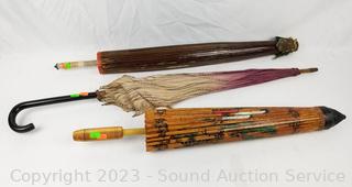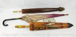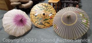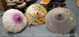 Parasols are hand painted, 1 paper, 1 vinyl, bamboo framed. 1 with pink cloth has loose frame pieces. Approx. 34" to 44" dia.