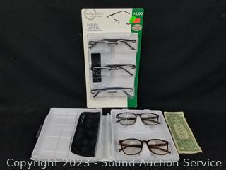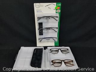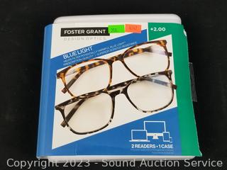Lot #0310: 3 Foster Grant +2.0 Reading & 2 Blue Light Glasses w/2 Cases