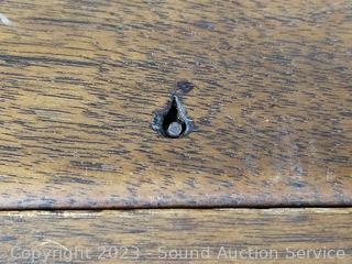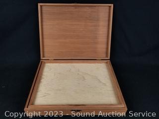 Vtg. Writing box with skeleton key lock (no key), 3.25" H x 12.25" W x 9" D. Overall 2.25" to 8.5" H x 5.5" to 15" W.