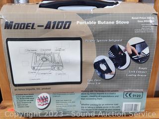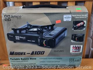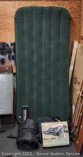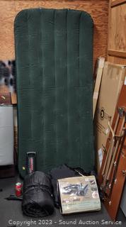Twin Air Mattress with Hand Pump, 2 Exxel Black Sleeping Bags, Amco Portable Butane Stove.