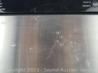 Has power, bag sealer works, had to manually start sealing process, unit just kept vacuuming. Handheld portion is untested. Has some cosmetic dings, scratches.