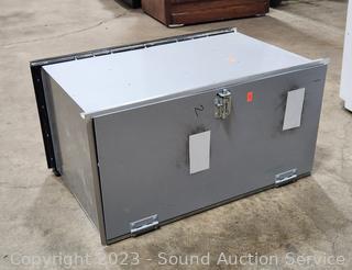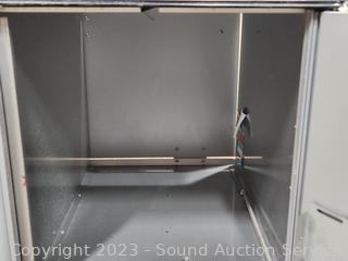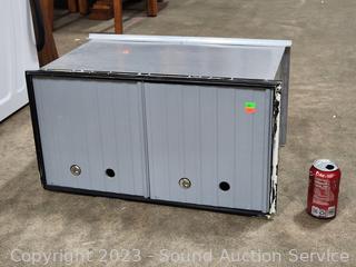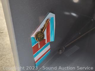 Rear access, comes with keys. 12.5" H x 22" W x 15". Various wear from use.