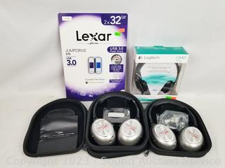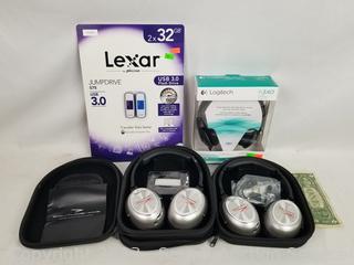 Lot #0188: 2 Solitude Wireless Headphones, Logitech Headset & 2 Flash Drives