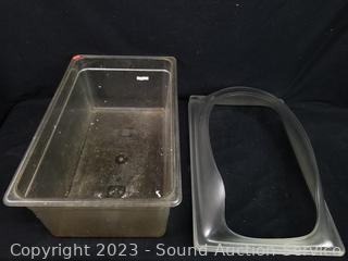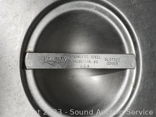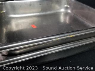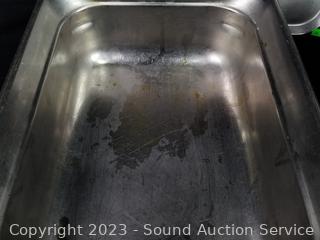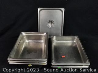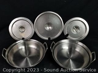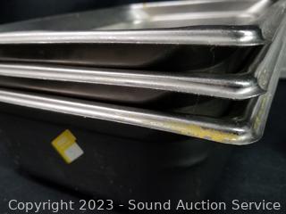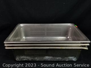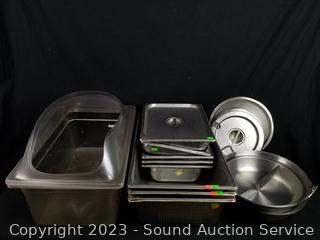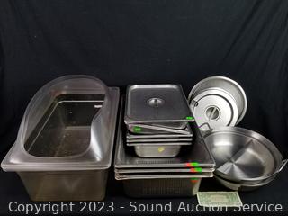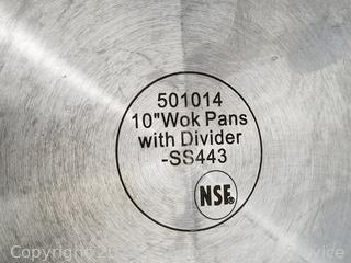 10" flat bottom woks, (5) 12" x 10" & (3) 12" x 20" pierced pans, (1) 12" x 20" plastic pan.
