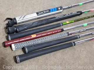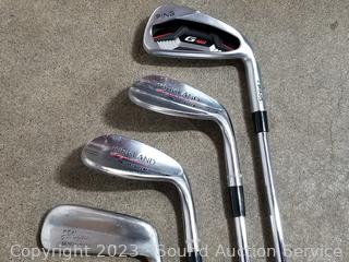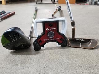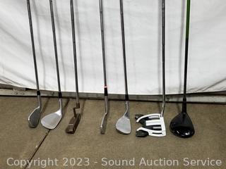 Kirkland, Spyder, Ping & Trinity clubs= 5W, 4 Iron, 2 Wedges, 3 putters, umbrella & box of balls.