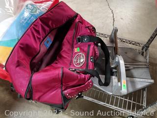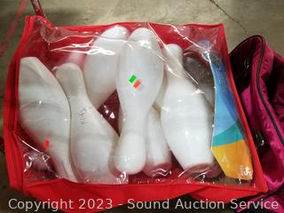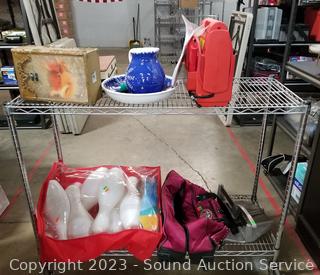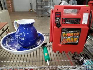 Hausen Ware snowflake print pitcher & basin, portable power station (untested, power button doesn't seem to want to stay in position), Kathy Bag, 13 piece PVC bowling set, tile cutter. ATTN: Items may be missing pieces, damaged, not functioning, complete, no issues, etc. All items as is. Refer to photos for lot contents. Cart Not included.