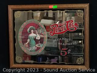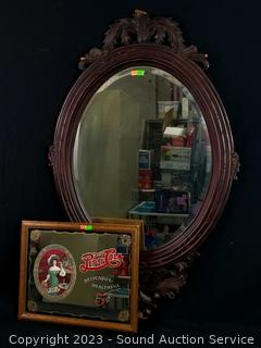 Oval mirror has some damage on frame, 37" x 23" & 12" x 15" Pepsi-Cola mirror.