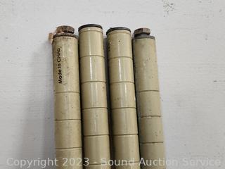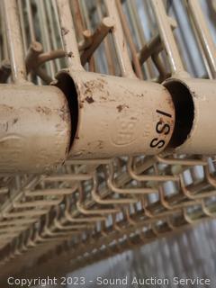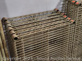 No plastic clips to hold shelves. (4) 75" poles, (4) 24" x 48", (5) 24" x 42", (6) 24" x 36" shelves. Signs of wear from use.