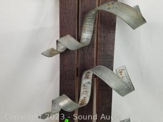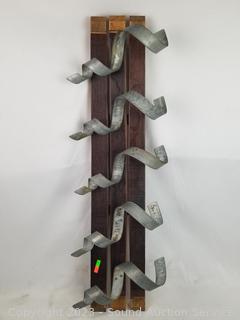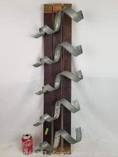 Approx. 36" x 12". Very interesting piece, repurposed from an old wine barrel, turned into a 5 bottle wine rack.