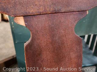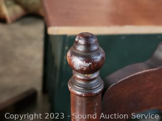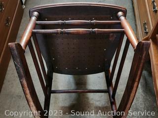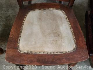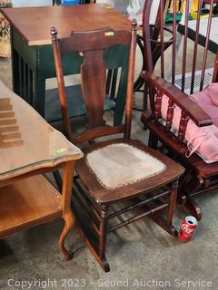 Some damage to back splat, splitting, missing pieces. 34" H x 16.75" W x 15" to seat.