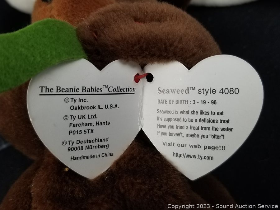 Contains one of the 20 most expensive Beanie Babies, 1995 Seaweed. Also includes 2006 Fun Anniversary, Laughter Anniversary, 2001 America, 2000 Cinders, 1997 Bruno, 1993 Blackie, 1993 Curly, 2001 Haunt, 1993 Peppermint, 2000 Ariel, 2004 Chompers, 2003 Fizz, 2000 Frigid, 2000 Holiday Teddy, 1999 Millenium, 1993 Erin the Bear Teenie, 2001 Mum, 1993 Maple the BEar Teenie, 2000 Chinook. All in excellent condition with original tags. 2 with acrylic cases.
