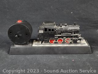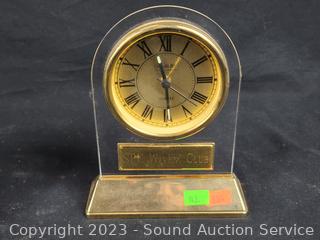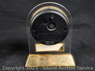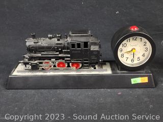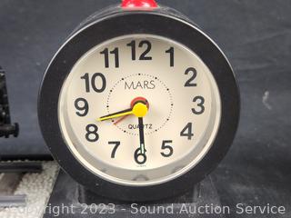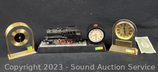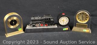 All are quartz & work. The 2 brass are by Danbury & Marathon, Train is by Mars. 5" to 6.5" H x 4.25" to 12" W/L.