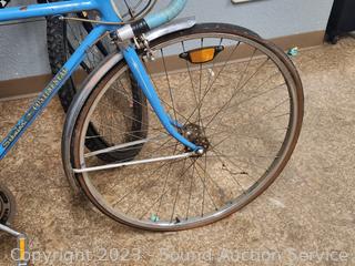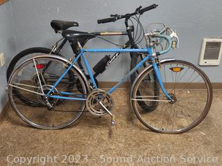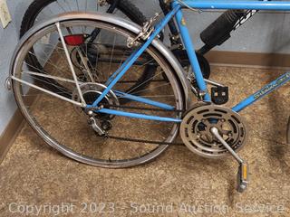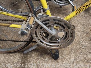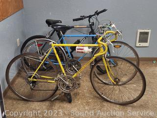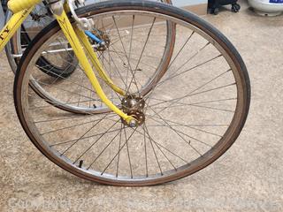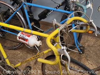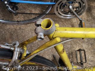 Schwinn Varsity Yellow (appears functional, seat not attached, tires are flat, everything appears to be working but needs cleaned, lubed). Schwinn Continental Blue (rear brake not working properly, everything else appears to be functioning as intended, tires are flat, dirty, needs a good cleaning, lubed). Huffy Caribou (appears to be functional, everything appears to be working as intended, tires are flat, dirty, needs a good cleaning, lubed). As is.