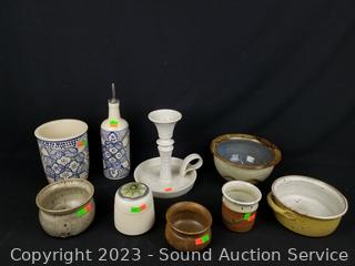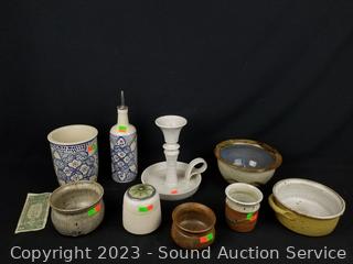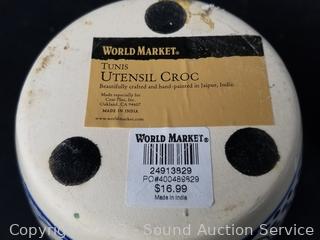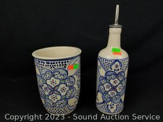 Lot #0213: 7pc Art Pottery Decor & 2pc World Market Cruet & Utensil Croc
