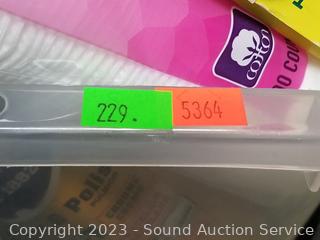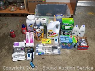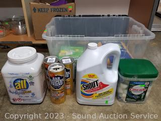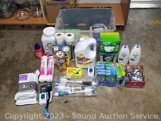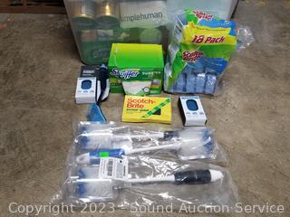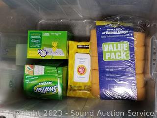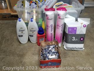 Dishwasher pods, toilet brushes, cleanser polish chemicals, Scotch Brite, laundry detergent, Dove body wash & more. Refer to photos for lot contents.