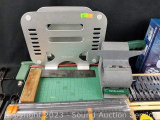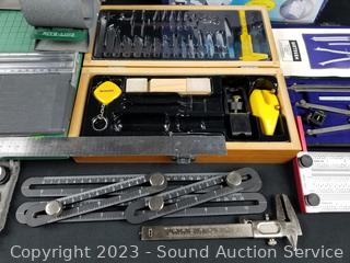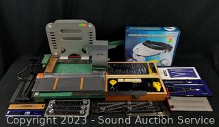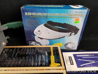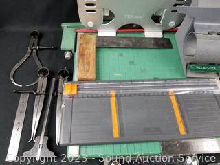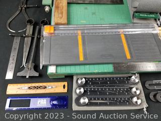 Lot #0155: Assorted Measurment, Precision Instruments, Paper Cutter, Magnifying Headband