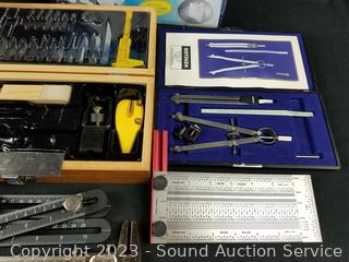 12 paper cutter, 2 LED magnifying headlamp, Xacto set, Dietzgen Satellite kit, rulers & more. Refer to photos for lot contents.