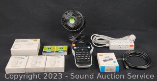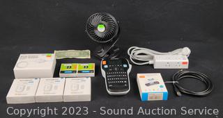 Dymo Label Manager 160 w/2 Label Cassette (has power), 2 Koogeek Window & Door sensors (untested). Power strip, display bluetooth adapter, clip fan, Wyze outdoor power adapter (sealed).