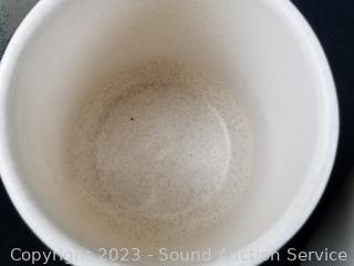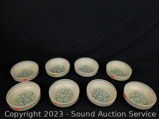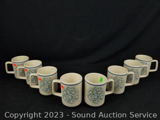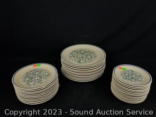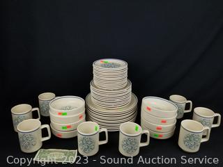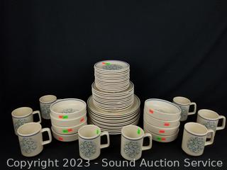 8 mugs, 8 bowls, 14 snack plates, 11 lunch plates, 12 dinner plates. Some minor scuffs from use, utensils. Comes with 2 plate storage bags. Don't see any other issues.