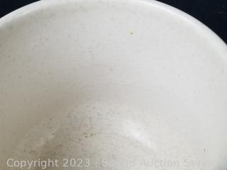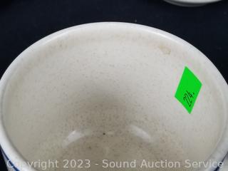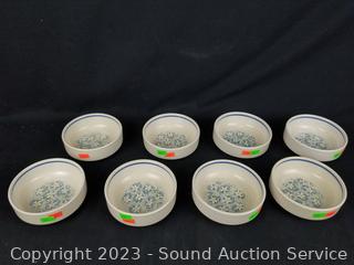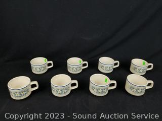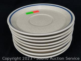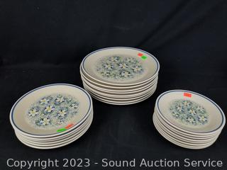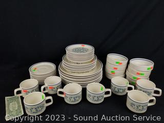 8 bowls, 8 cups, 8 saucers, 8snack plates, 6 lunch plates, 9 dinner plates. Light wear from use, Don't see any major issues.