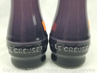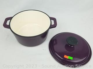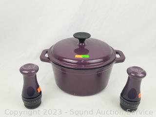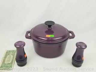 Lot #0236: Purple Bella Cast Iron Enameled Dutch Oven & Le Creuset S&P Shakers