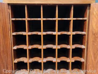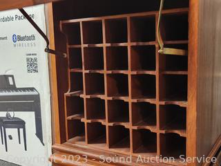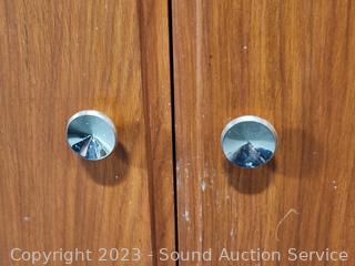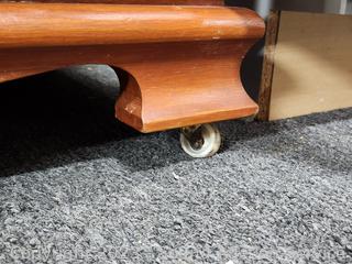 On casters for easier movement, however doesn't roll well. Both ends open up but oddly, one side with normal cabinet doors, other lifts from the bottom up. Some minor scuffs, wear to finish. 28" H x 18" W x 21.5" D.