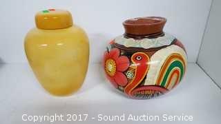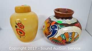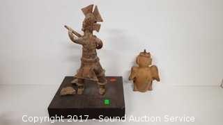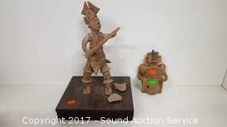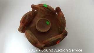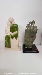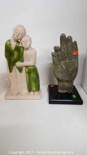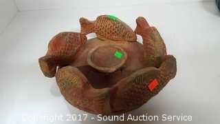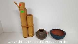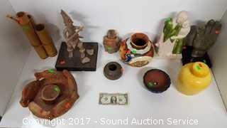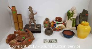 Includes: Pottery bowls, bamboo vase, statue of a couple, fish candle holder. Statues are approx. 13" tall.