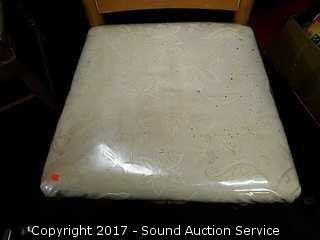 Seats are wrapped in vinyl. Approx. 30" tall, 78" long with the leaves, each leaf is 18" wide. Some scuffs on the top and ware in the finish.