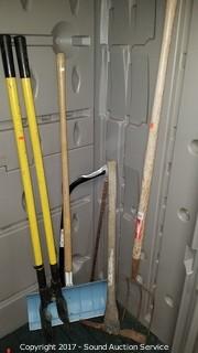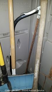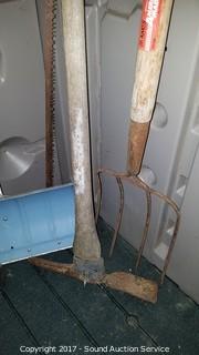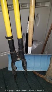 Lot #0234: Pitchfork, Pick Axe, Post Hole Digger, Snow Shovel & Bow Saw
