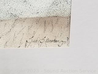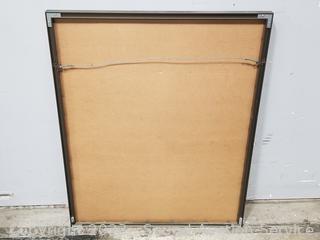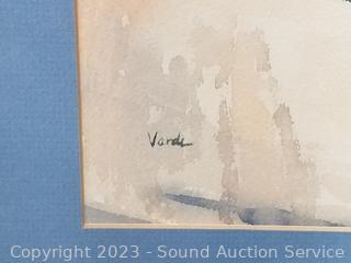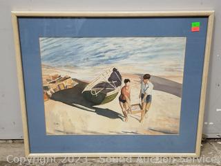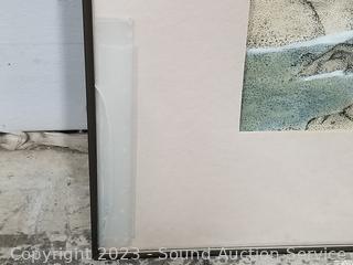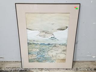Varde signed beach scene watercolor, 20.5" x 17". Sue Stenman '75 original dot watercolor coastal seagull artwork, 29" x 23", has a crack in glass.