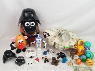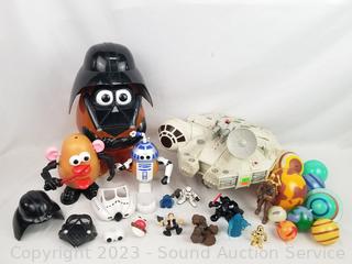 Darth Vader Potatoe Head, 14" H x 8" Dia. Millenium Falcon toy with figures, 7.5" H x 11" x 11.5".