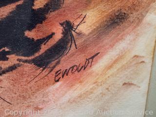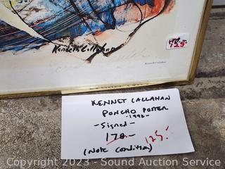 Original abstract signed Ewodt, 29" x 24". Kenneth Callahan signed "Poncho" poster c.1992, 24.5" x 36".