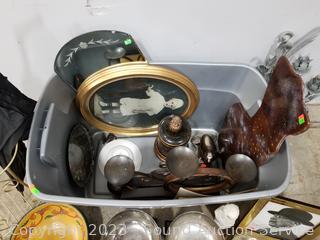 Matel art wall light decor, umbrella with antler handle, vtg. child portrait, art glass piece, beveled mirror, candelabra, trophies, figures, various other household goods. ATTN: Items may be missing pieces, damaged, not functioning, complete, no issues, etc. All items as is. Refer to photos for lot contents.