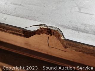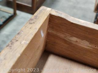 35.5" H x 35.5" W x 21" D. Various wear from age, use. Top drawers are locking, no key. Solid wood construction, not sure what the top is, some sort of laminate. Great for use in a shop.