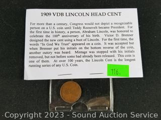 Lot #0116: (1) 1909 VDB & (8) 2009 100th Anniversary Lincoln Cents