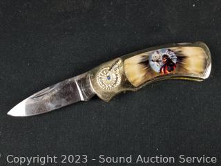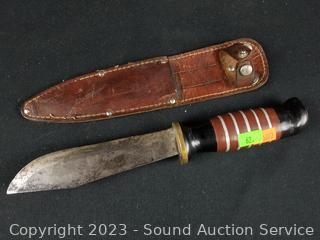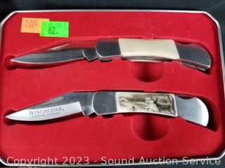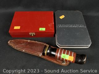 No makers mark on fixed blade knife, 10" long, 5.5" blade, not original sheathe, doesn't fit properly. Native scene gift knife. Set of 2 Limited Edition Winchester Gift Set knives.