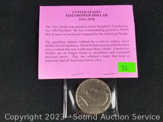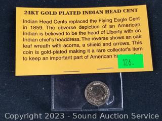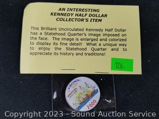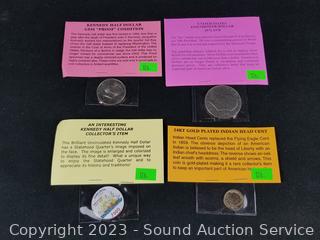 1879 24kt Gold Plated Indian Head Cent, 2005 Gem Proof Kennedy Half Dollar, 2000 Kennedy Half Dollar Painted in Virginia Statehood Quarters Image, 1972 40% Silver Eisenhower Dollar. ATTN: We are not coin or currency experts or graders, please use your own judgement when bidding.
