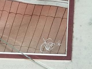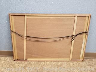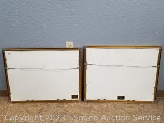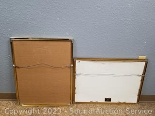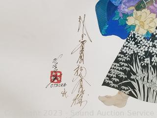 One by Otsuka, 3 others by the same artist, signed, unable to make out signature (2 with broken glass, one with missing glass), golden one don't see a signature. 22" x 28", 37" x 25". Refer to photos for more info.