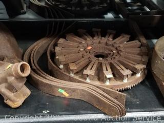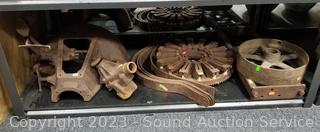 Tractor transmission w/pedals, water pump, leaf springs, gear, pulley wheel. Refer to photos for more info.