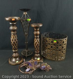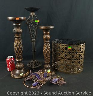 Lot #0228: Candleholders, Butterfly Hanging Decor, Wastebin