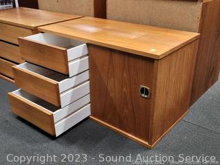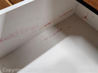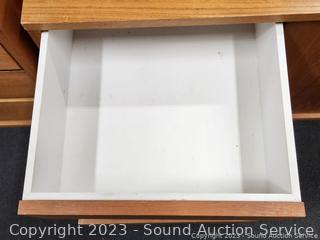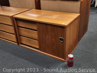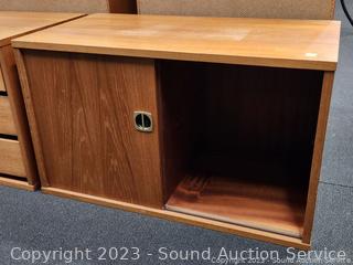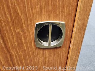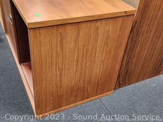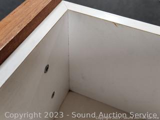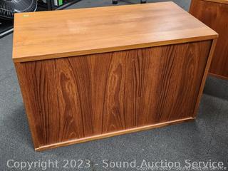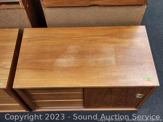 Some staining, wear to finish. Believe teak veneer finish. 18" H x 30" W x 16" D.