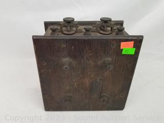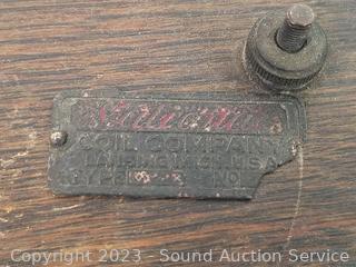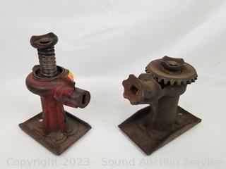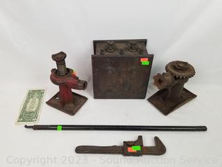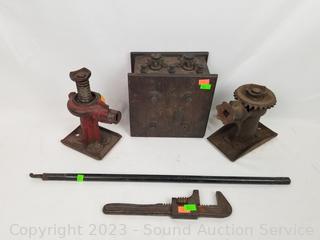 Screw & gear jacks, 9" pipe wrench, Olde National Coil Co. Battery/Coil? 7" x 7" x 4".