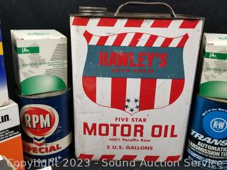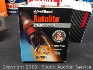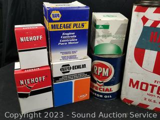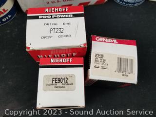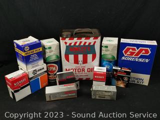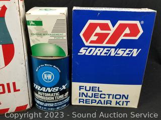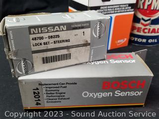 GP Sorensen Fuel injection repair kit, RPM Motor oil, Nissan Sterling lock set 48700-0B225, Filko Ignition coils DC63, Oxygen sensor 12014, Niehoff Diaphragm FE9012, Valve 3-3066A, Autolite Spark Plugs AP664, 2 gallon Five Star Motor Oil (half full) & more.